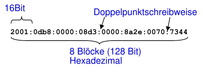 IPv6 hat 128 bit, die in Doppelpunkt-Schreibweise in Hexadezimalen Zahlen dargestellt werden, also Zahlen von 0 - f.
