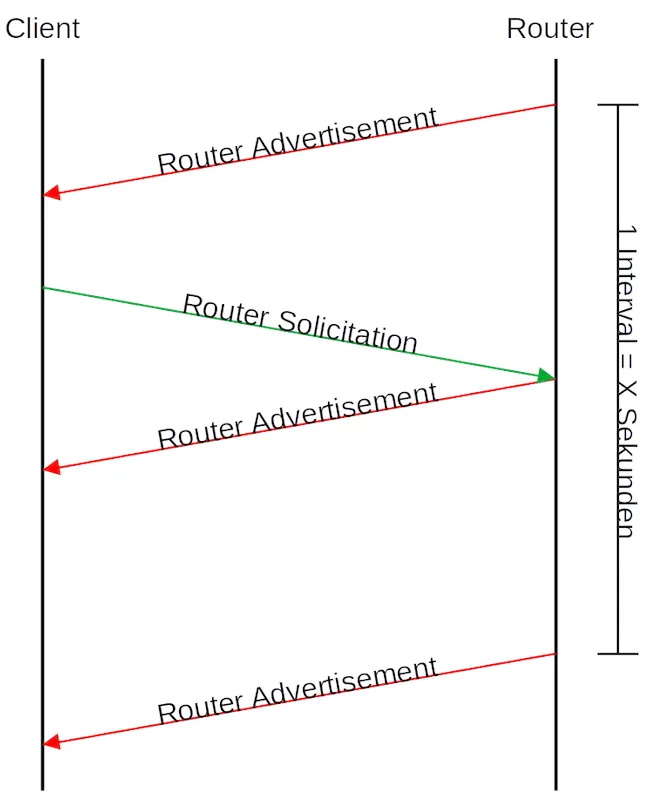 Falls der Client aber den Router Advertisement verpasst, kann er diesen über eine Router Solicitation anfordern 1 = Multicast für alle Router.