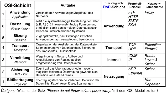 Das OSI-Modell ist ein Schichten-Modell, welches die Übertragung von Daten in einem Netzwerk beschreibt. Ein ähnliches Modell ist das DoD-Modell. Es ist vom Aufbau identisch. Es werden nur die obersten drei OSI-Schichten zu einer Schicht zusammen gefasst.