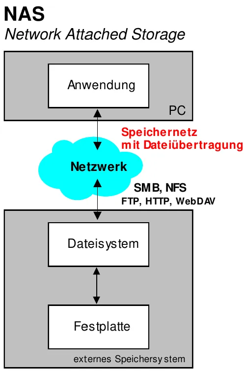 Beim NAS (Network Attatched Storage) wird ein Laufwerk über das Netzwerk mittels eines Protokolls wie z. B: SMB, WebDAV, FTP eingebunden. Die Daten werden dabei Dateiorientiert versendet, da die Aufteilung auf die Blocks von dem Server erledigt wird (Dateisystem ist ebenfalls ausgelagert).