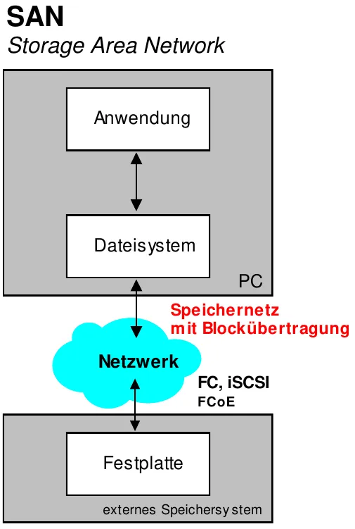 Hier werden die Daten ebenfalls auf einen Remoten-Speicher abgelegt. Im gegensatz zur NAS, wird beim SAN (Storage Area Network) das Dateisystem NICHT auf den Server ausgelagert. Die Datenübertragung ist hier Blockorientiert. Hier werden Technologien wie FC (Fibre Channel), FCoE (Fibre Channel over Ethernet) oder iSCSI (Internet SCSI)