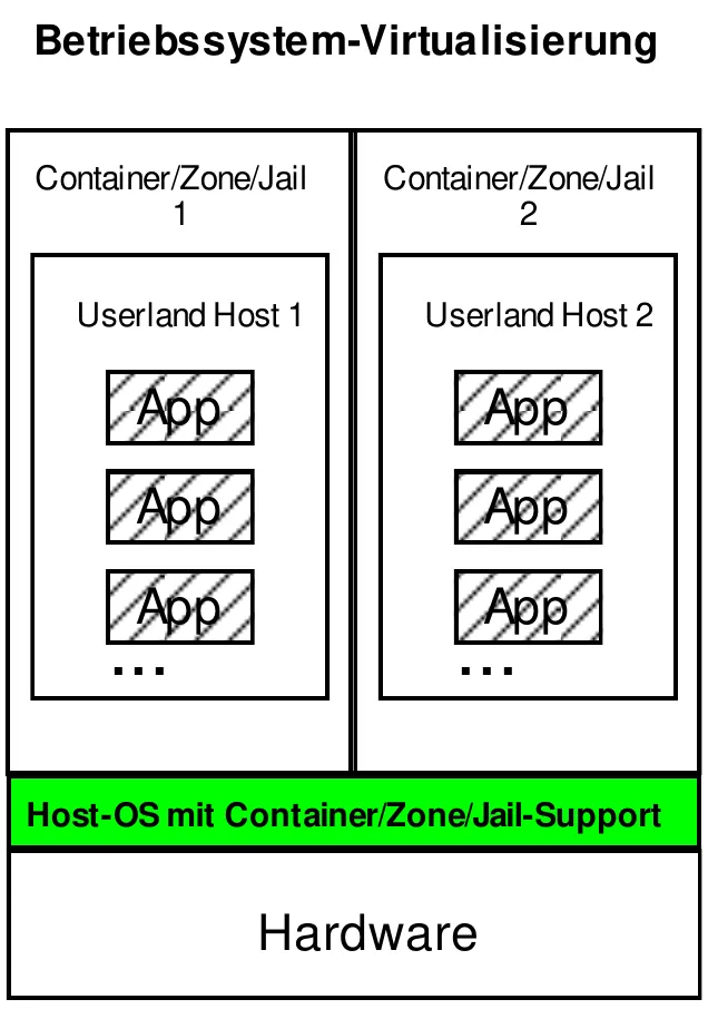 Bei einer Betriebssystem-Virtualisierung wird der Kernel des Vorhandenen Host-OS verwendet und lediglich ein weiterer User-Mode hinzugefügt.