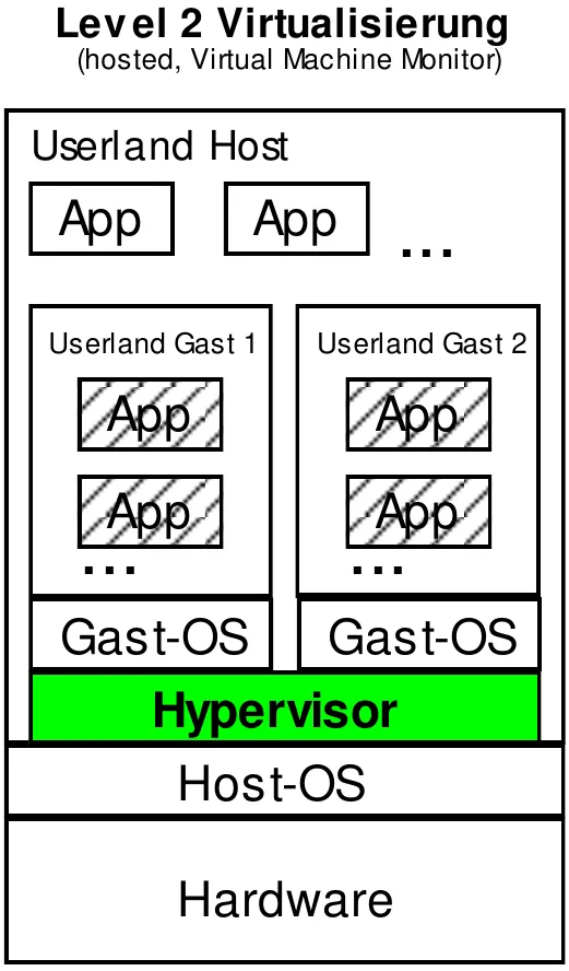 Bei der Level 2 Virtualisierung befindet sich der Hypervisor über dem Host-OS. Es ist weniger Performant als eine Level 1 Virtualisierung, jedoch besser für Testumgebungen geeignet.