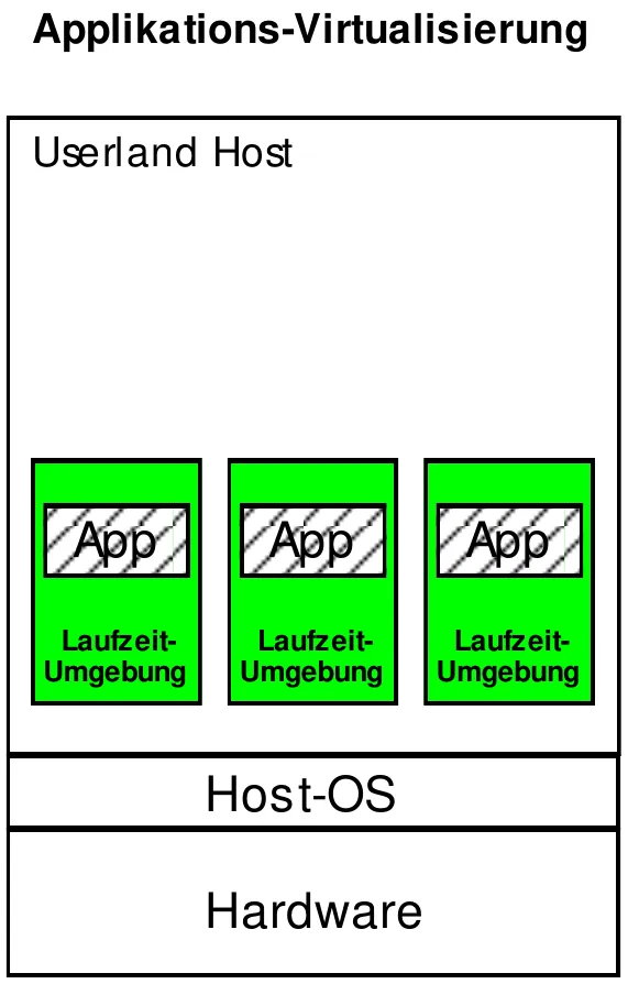 Wenn nur einzelne APPs in einer VM laufen, nennt man das Applikations-Virtualisierung. Ein Beispiel dafür ist JAVA mit dem Java Virtual Maschine (JVM).