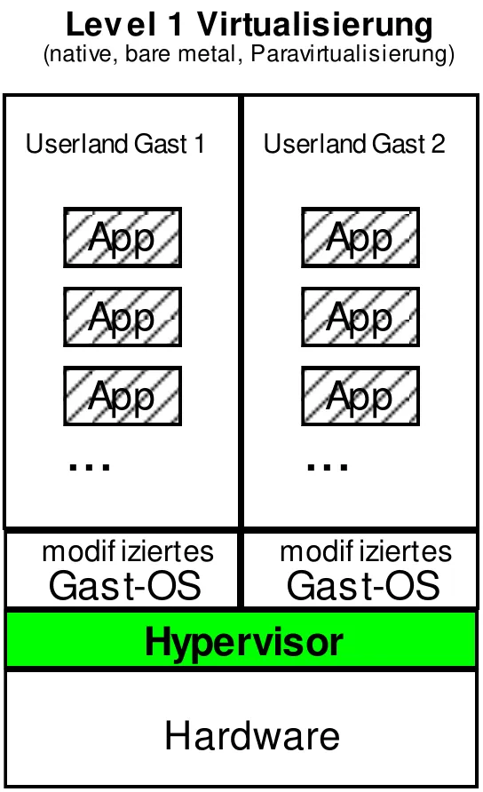 Bei der Level 1 Virtualisierung wird der sogenannte Hypervisor auf den Ring 0 geschoben.