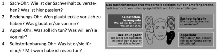 Das Vier-Ohren-Modell von Friedemann Schulz von Thun beschreibt warum Menschen etwas falsch verstehen können und wird dafür benutzt um Aussagen zu analysieren.