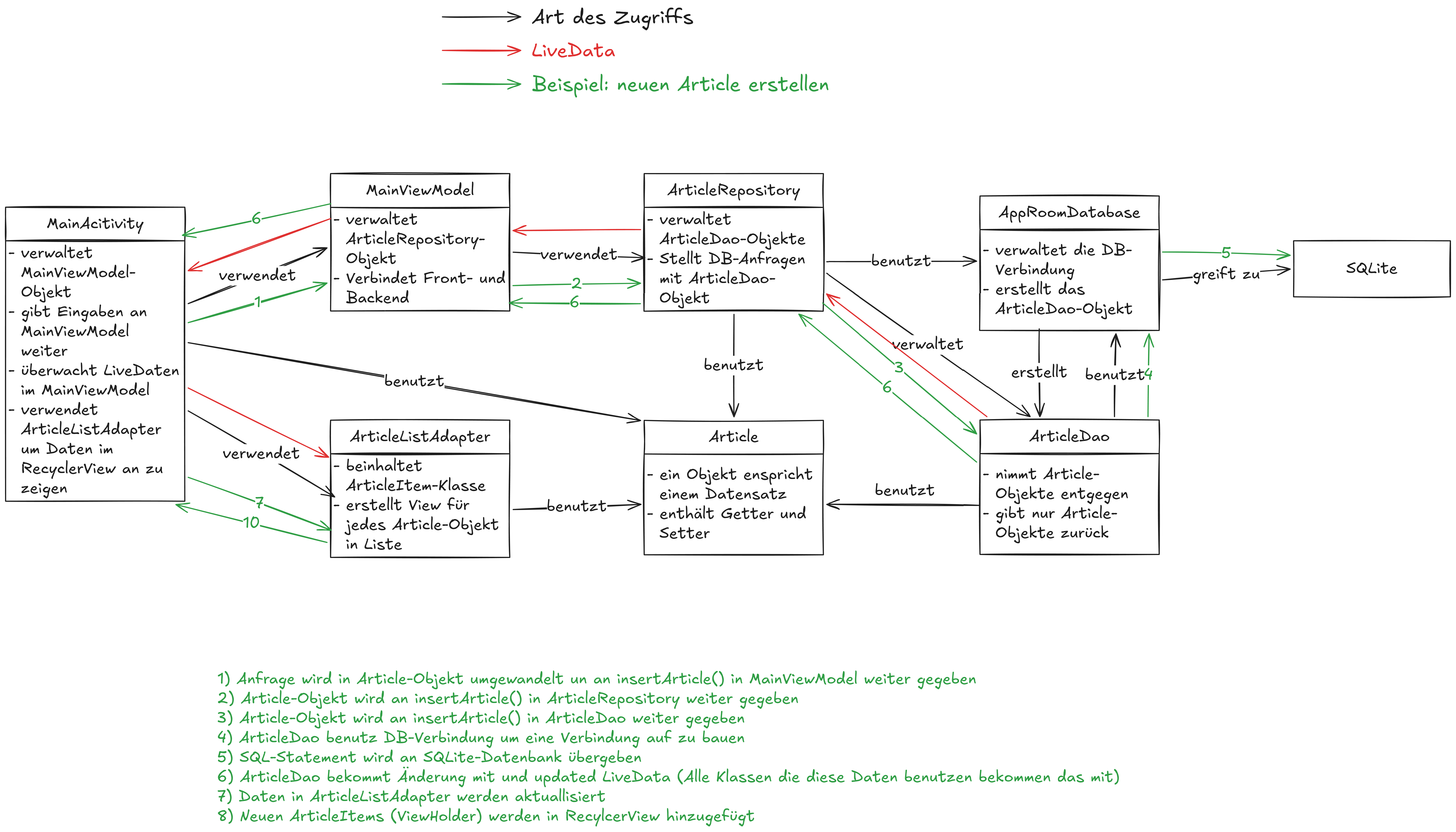 - Das Repository interagiert mit der Room Datenbank um auf die Datenbankinstanz zu zugreifen