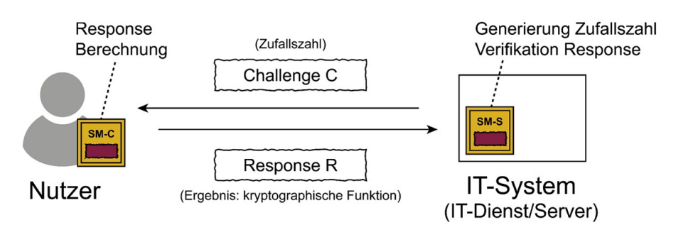 Der Nutzer muss aus einer vom Server geschickten Challenge (C) mit Hilfe eines Sicherheitsmoduls eine Response berechnen und zurücksenden.