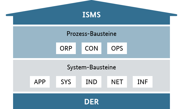 Die verschiedenen IT-Grundschutz-Bausteine sind in ein Schichtenmodell gegliedert, das wie folgt aufgebaut ist (in Klammern werden exemplarische Bausteine genannt):