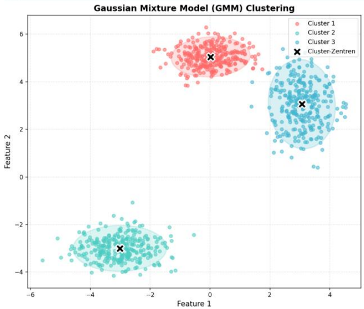 - Aktualisiere die Parameter (Mittelwerte, Kovarianzen und Gewichte) basierend auf den Wahrscheinlichkeiten aus dem E-Schritt.