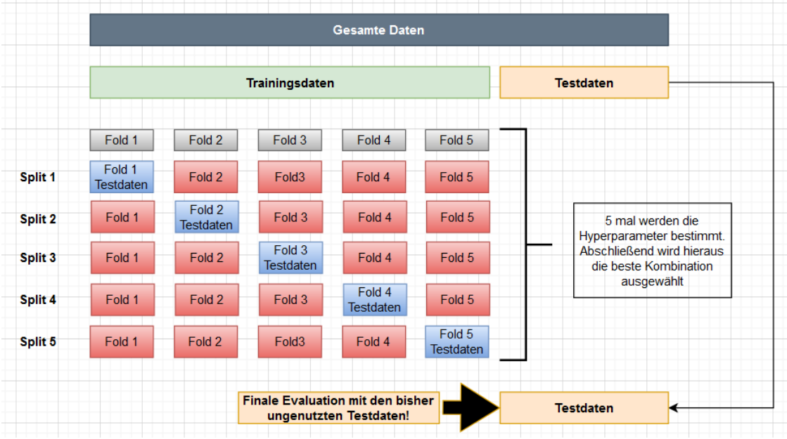 Neben den Hyperparametern spielen die Test- und Trainingsdaten eine erhebliche Rolle bei der Bewertung. Man teilt die Trainingsdaten in k-Bestandteile auf (z.B. k=5 hier Fold). Anschließend werden die k-Modelle (hier Split bzw. Iteration) trainiert. Dabei werden je Modell immer ein Fold als Testdaten benutzt. Abschließend ergibt sich für jedes dieser Modelle (Iteration) ein Score. Zuletzt bildet man den Mittelwert über alle Scores und erhält somit eine aussagekräftige Größe.