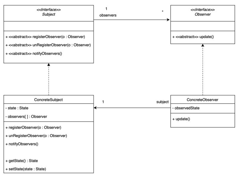 Ein Subject hat Daten und eine Liste welche Objekte (Observer) bescheid bekommen wollen, wenn sich die Daten ändern. Dann geht er die Observerliste durch und sagt allen Observern, dass es ein Update gab. Deswegen ein Interface für Observer, damit überall die Methode .update() verfügbar ist. Was die Observer dann damit machen ist ihr Bier.