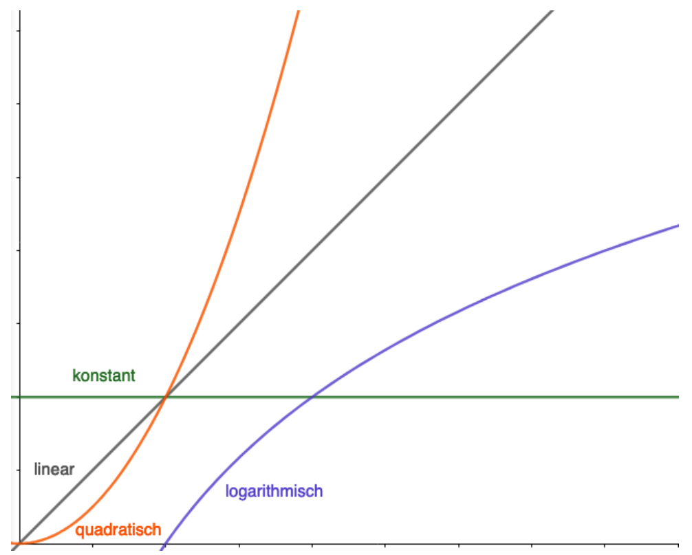 Von einer theoretisch berechneten Laufzeit ist nur relevant. Das bedeutet unter anderem, dass nur Schleifen und rekursive Aufrufe betrachtet werden müssen. Aus der exakten Laufzeit wird also ungefähr . Dafür gibt es die kurze Schreibweise .