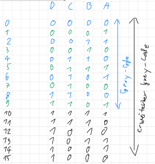 Bisher wurden mehrschrittige Codes betrachtet, d.h. dass beim Wechsel von zwei aufeinanderfolgenden Tetraden mehrere Bits verändert werden → Fehleranfällig, da undefinierte, falsche Zustände möglich sind. Der Gray-Code ist einschrittig